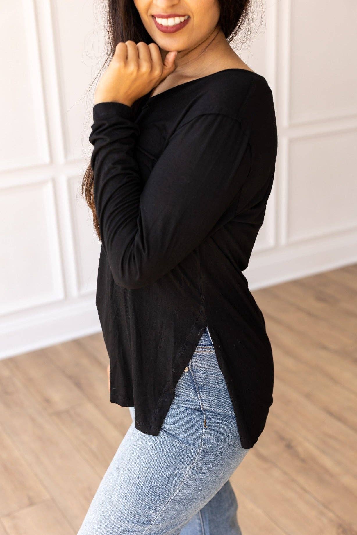 Looking for something more than your ordinary top? Spice up your style with our Black Long-sleeved Side Split Top! Not only is it super comfortable, but its hip side-split adds a touch of trendiness. Consider it your go-to layering essential - this top pairs seamlessly with any outfit in your wardrobe. Get ready to rock a casual yet fashion-forward look with this cozy top.