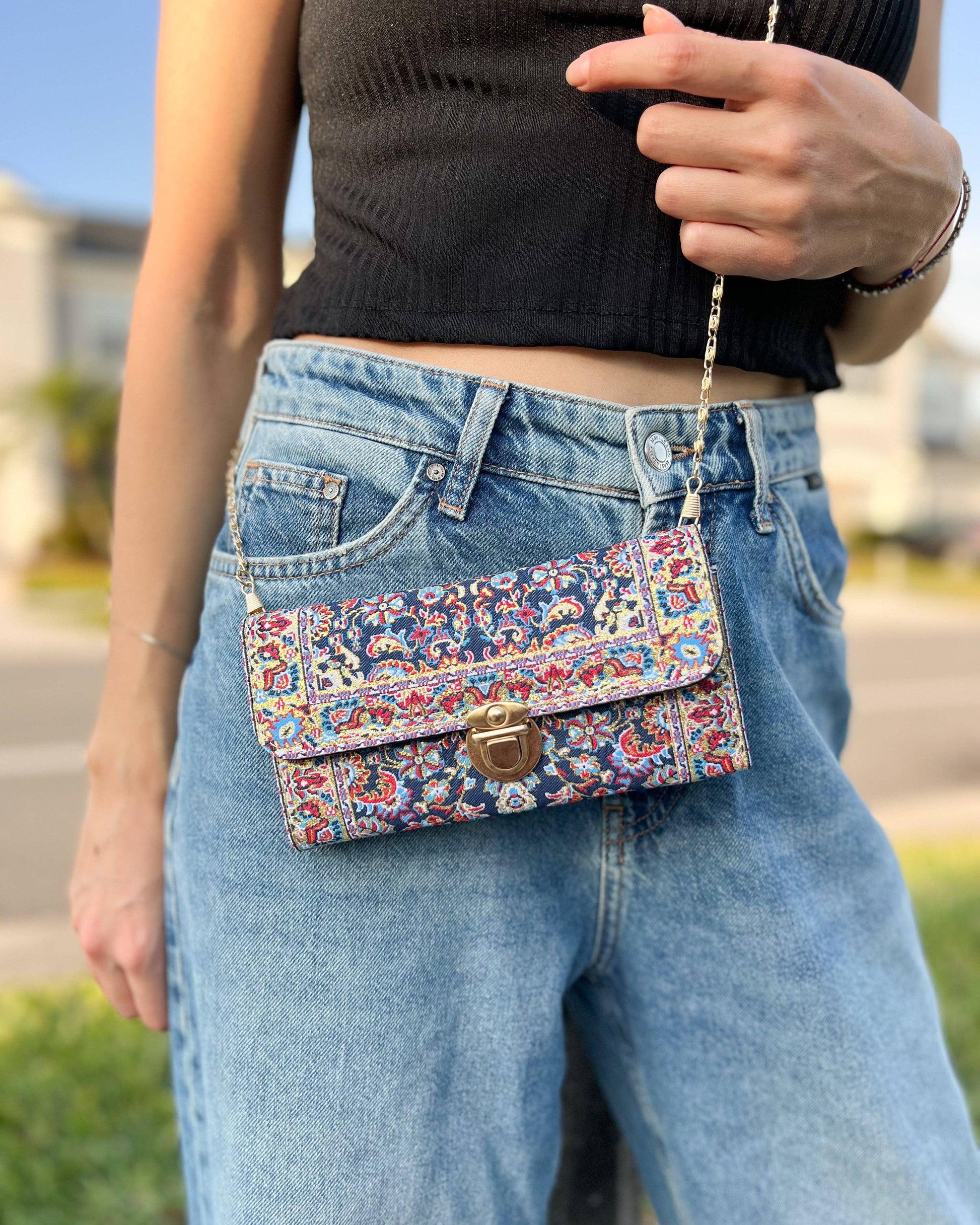 This Boho crossbody bag is made of Turkish carpet patterned brocade fabric and vegan leather. It has a metal clasp and metal chain. It can be used as a trifold wallet when you take the chain out.